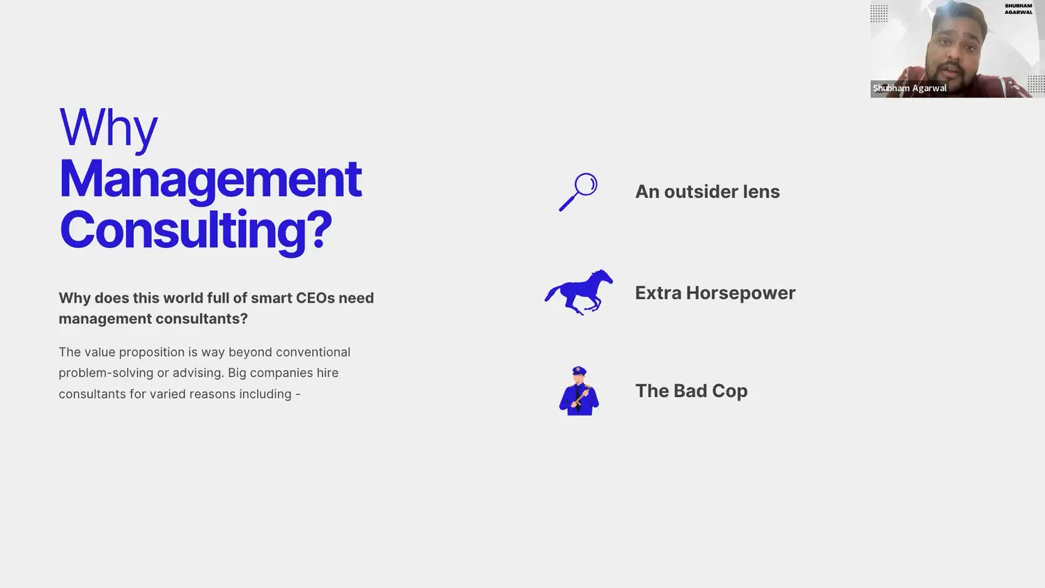 Experienced strategy consultant and entrepreneur with expertise in commercial strategy and management consulting domain. Over the last eight years, Shubham has helped multiple multinational corporations across their commercial design and business optimization. Shubham has pursued a Master of Business Administration - MBA focused on Strategy from the University of Cambridge. In this free management consulting course you will learn all the aspects of management consulting from the scratch.